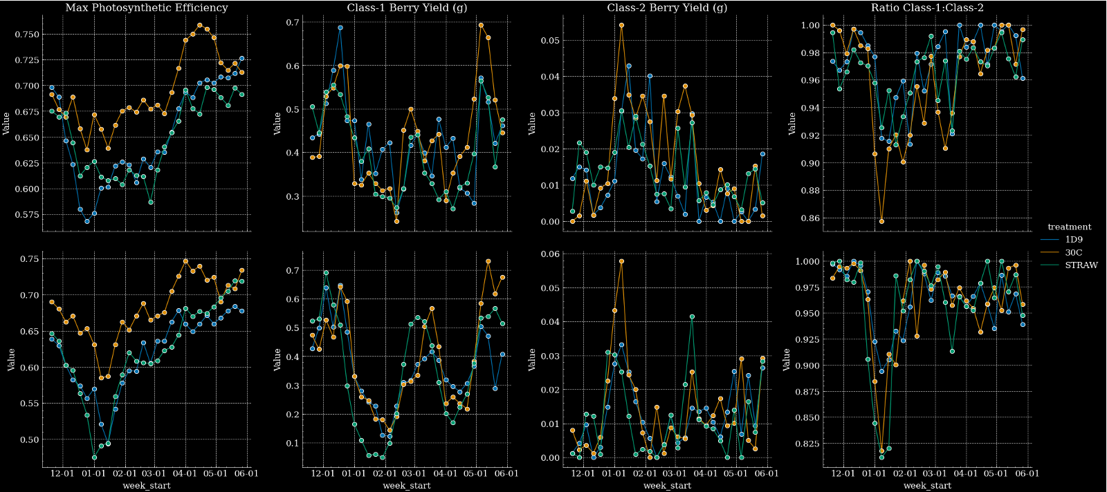 Fig.3 Albion (top) and Favori (bottom) photosynthetic efficiency and berry quality during Winter 23/24 season.