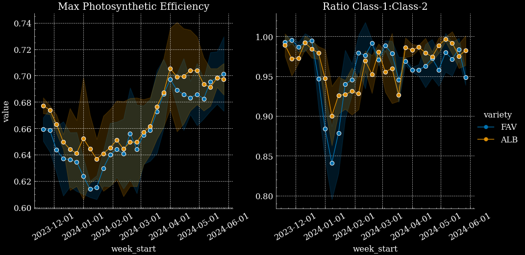 Fig.1 Left: Chlorophyll fluorescence values of max photosynthetic efficiency in Albion and Favori berries over the winter season. Right: ratio of class-1 to class-2 berries fell from 1.00 to 0.85, showing an 15% decrease in top-grade yield.