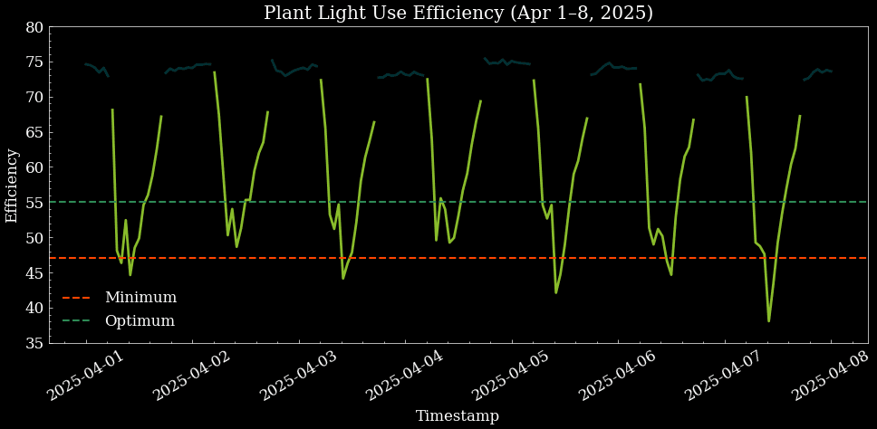 Fig. 3 Plant Light Use Efficiency in first week of April 2025 during De Peelkroon's 'No-Shading Period', showing efficiency falling below minimum level.