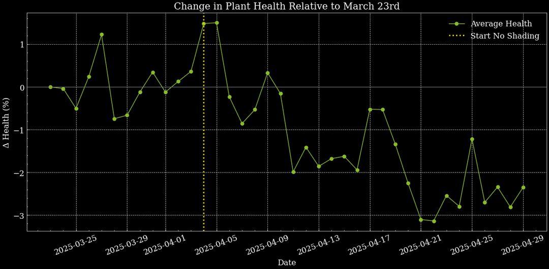 Fig. 4 Plant Health Change from March to May 2025, showing a decrease in health in two sections after the start of the ‘No Shading Period' at De Peelkroon.