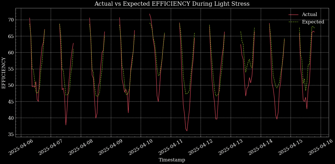 Fig. 5 Actual vs Expected Efficiency during No-Shading Period, April 2025 at De Peelkroon. Graft shows actual efficiency dropping below expected.