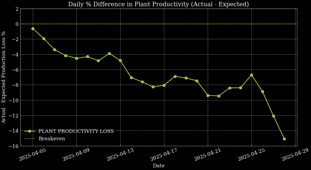 Fig. 6 Daily Percentage Difference in Plant Productivity during No-Shading Period, April 2025. Graph shows a decrease in two sections of De Peelkroon.