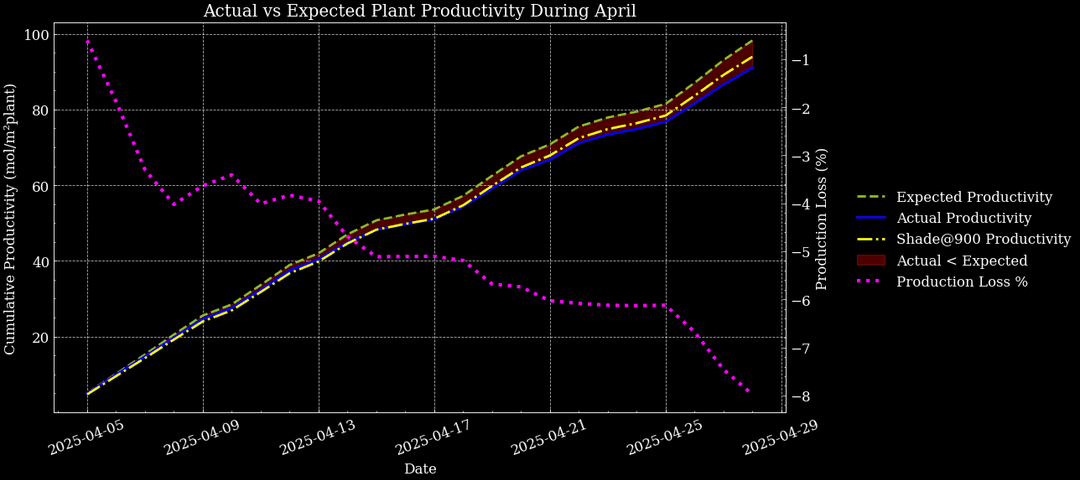 This study used Gardin sensor data to estimate potential production had the plants maintained their high health scores from early April, before light stress, by modelling the plant light response (R2 score = 70%). The results showed that with no-shading, photosynthetic efficiency dropped well below expected levels, indicating less of the available light was converted into assimilates.