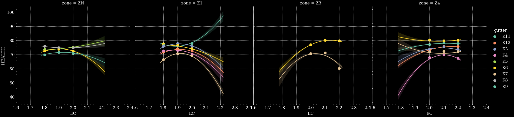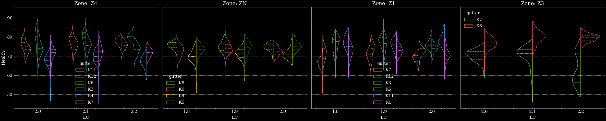 Fig. 2 - Health values in 9 different gutters and 4 different zones of Fromboer greenhouse, showing the impact of varying Electro Conductivity of irrigation solution on plant health. Health can be used as a tool for rapid feedback on optimal irrigation strategy.