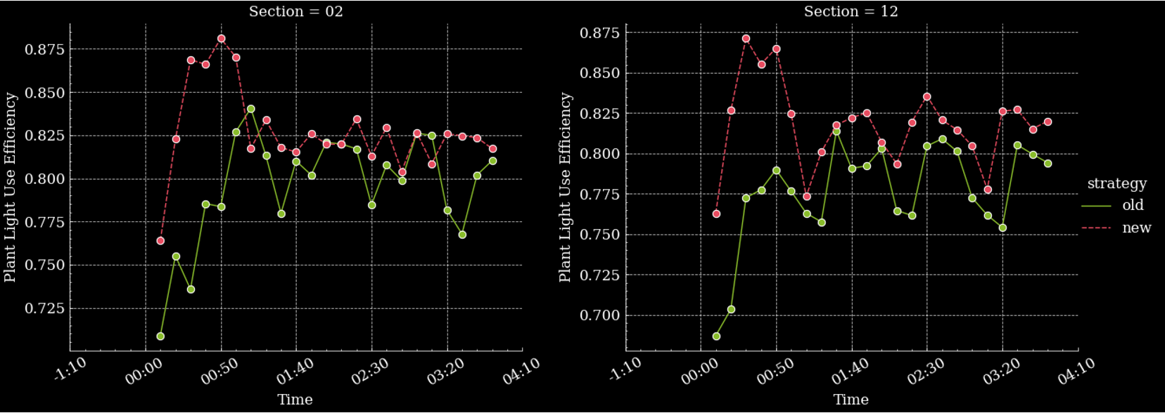Fig. 4- Plant light use efficiency over time for two different sections of Fromboer greenhouse, showing an improvement using Gardin's new strategy (red) where LED lighting is dimmed at 50% for the first 60 mins of each day to allow up-regulation of photosynthesis.