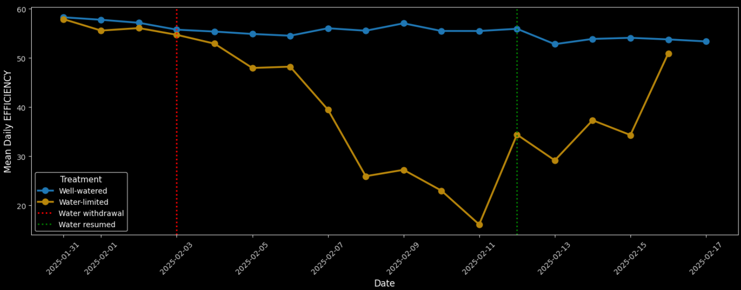 Daily Photosynthetic Efficiency identifies early drought stress during Ljusgårda water-use trial. Initially, Water-limited group was given half the water of the well-watered control. Then, on 2025-02-03 water was completely withdrawn from the water-limited lettuce plants. Gardin saw an immediate decline in photosynthetic efficiency the following day, which continued to deteriorate until the plants were recovered by resuming water supply.