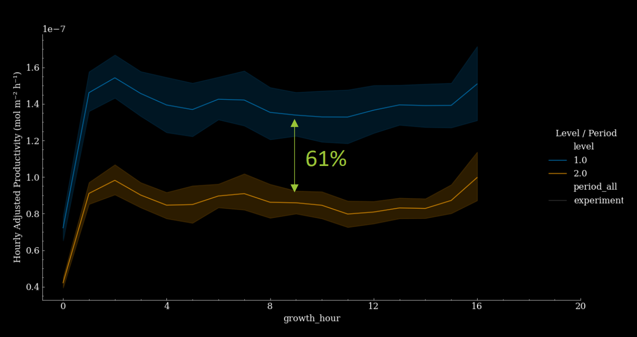 Light optimisation supported by Gardin's photosynthetic insights led to increased photosynthetic productivity by 61%. Hourly productivity shows the amount of light absorbed by the plant used for photosynthesis (electron transport rate). Increasing light intensity increased electron transport, providing more energy for CO$_2$ fixation.