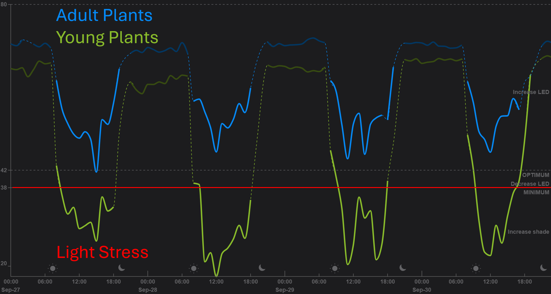 This stress is not only visible during the day. It also shows up at night, where the plants fail to fully recover, showing a damaged engine. The consistently low night-time efficiency indicates ongoing stress, which can eventually lead to symptoms such as leaf yellowing. As shown in figure 2, their photosynthetic efficiency dropped below the minimum efficiency during the day, while receiving the same light intensity as the adult plants. This means the young plants need to work too hard, causing the engine of photosynthesis to break. This then lead to a low and stressed recovery during the night, clearly showing a permanent state of stress, which will lead to yellowing of the leaves if not resolved.